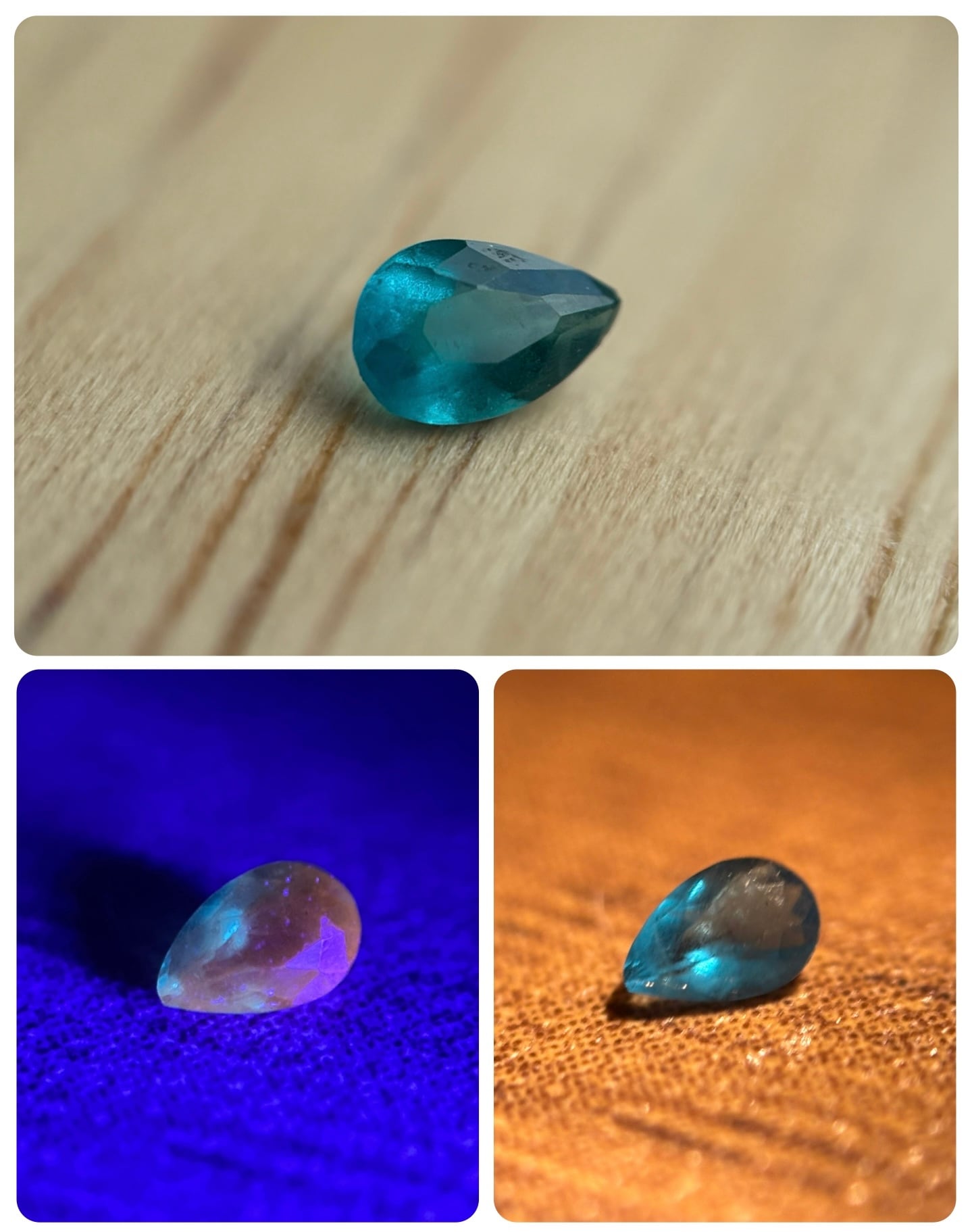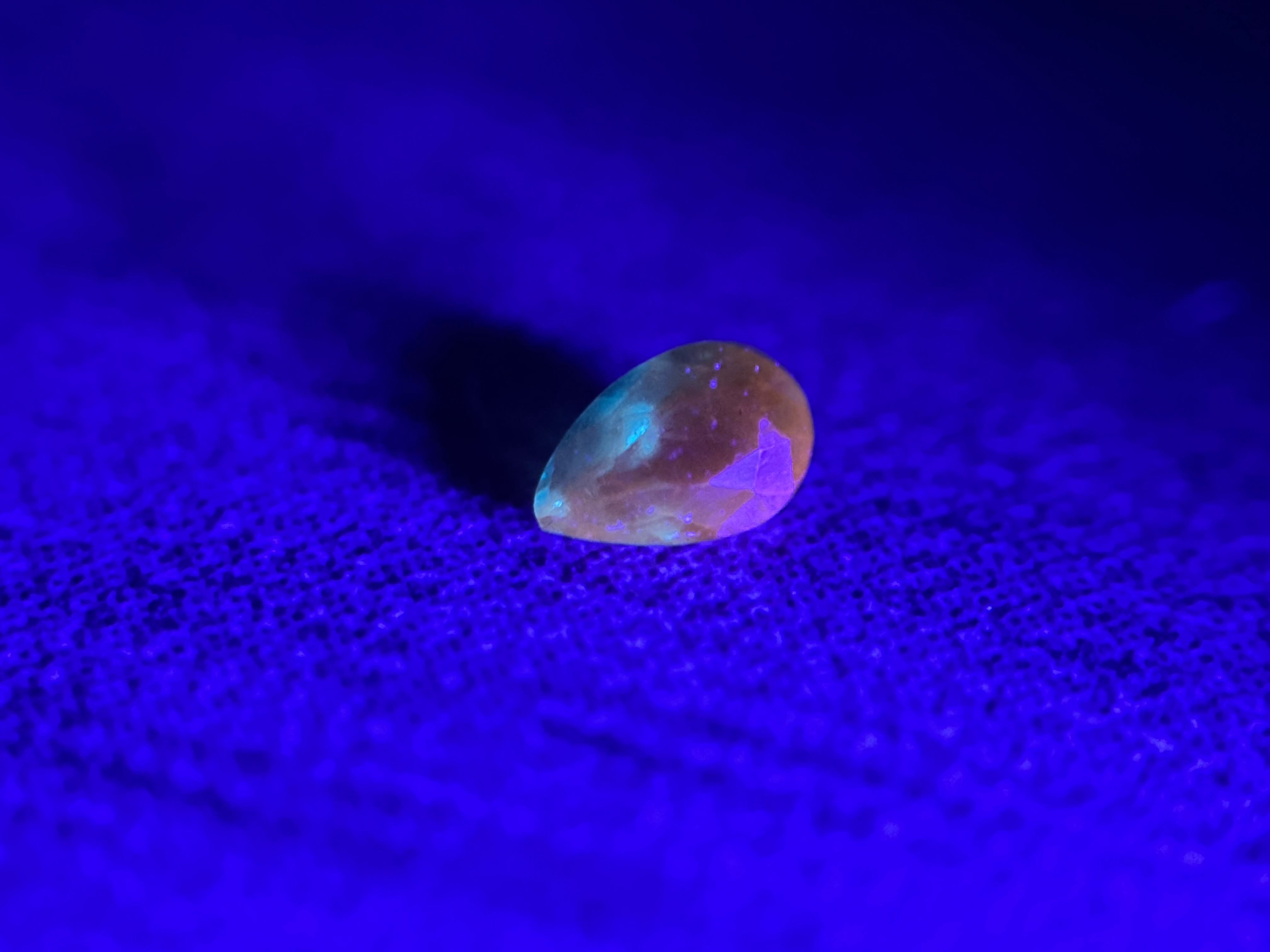 この子はグリーンアウイの中でも抜群に色乗りの濃い子です。なお、市販のペンライトの白熱灯にて、青緑から青へのカラーシフトが確認できます。マットな質感ですが、それにより蛍光が他のルースよりも強く感じられます。