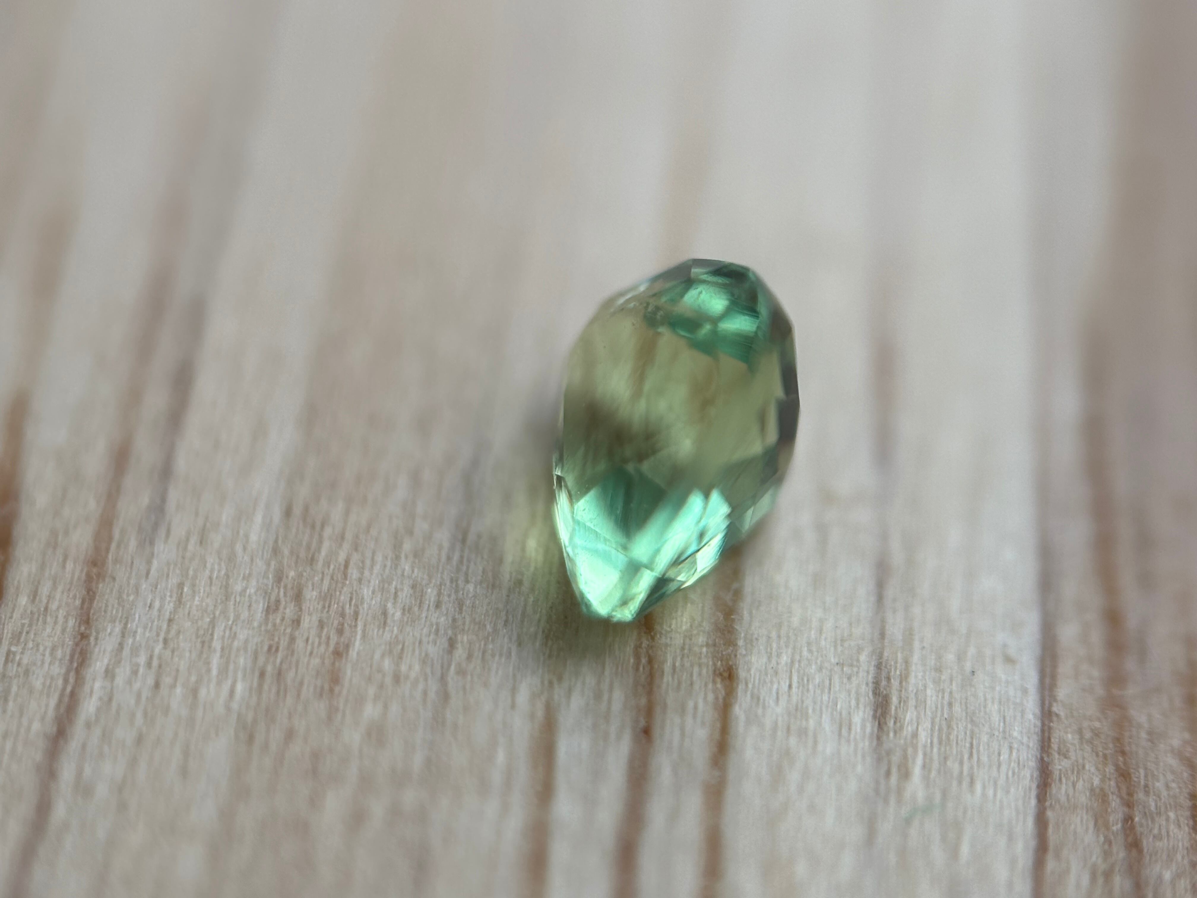 この子はグリーンアウイの中でも抜群に透明度の高い子です。恐らく今出品している子では1番透明な子かと思われます。なお、市販のペンライトの白熱灯にて、黄緑から水色へのカラーシフトが確認できます。