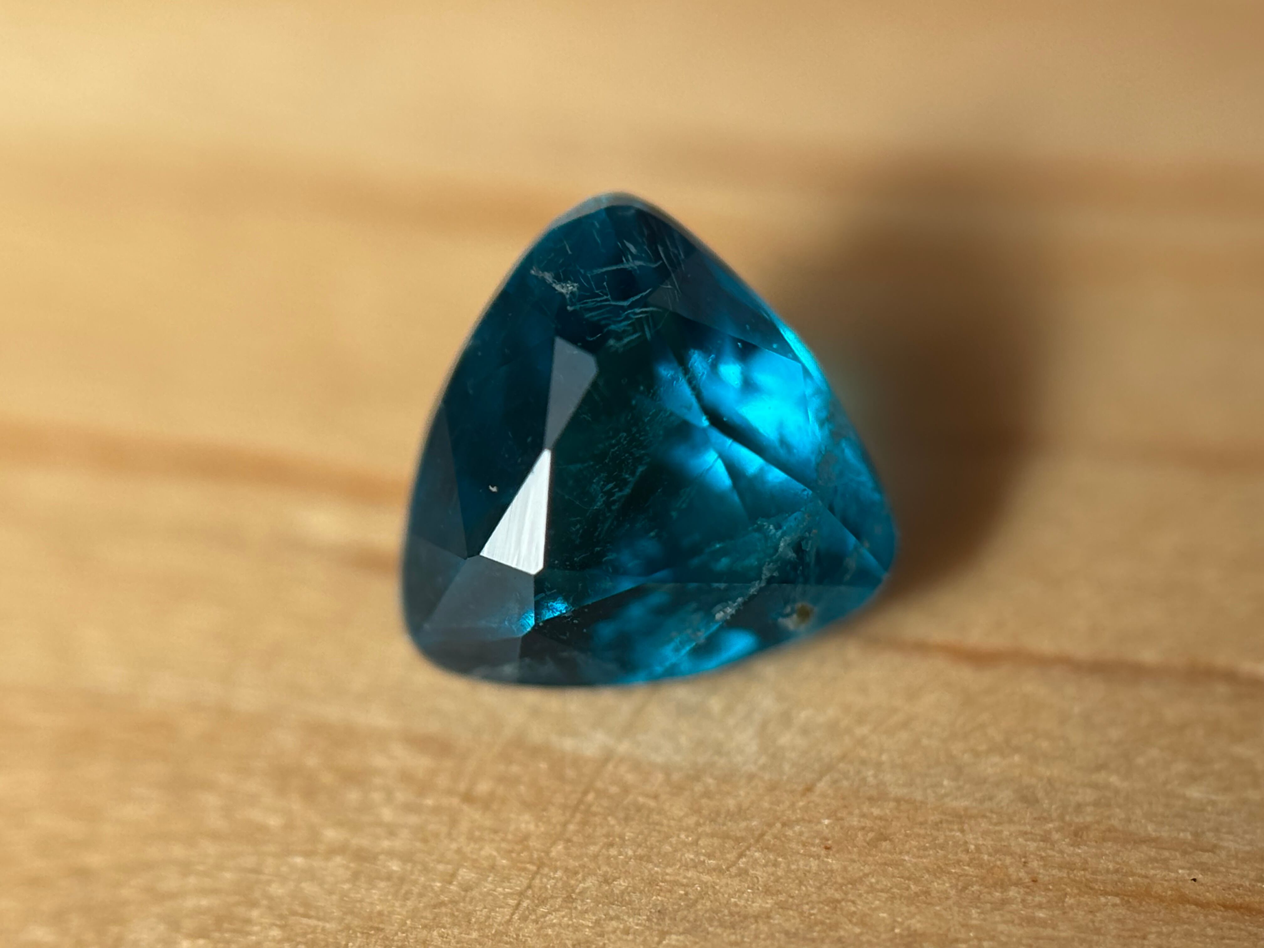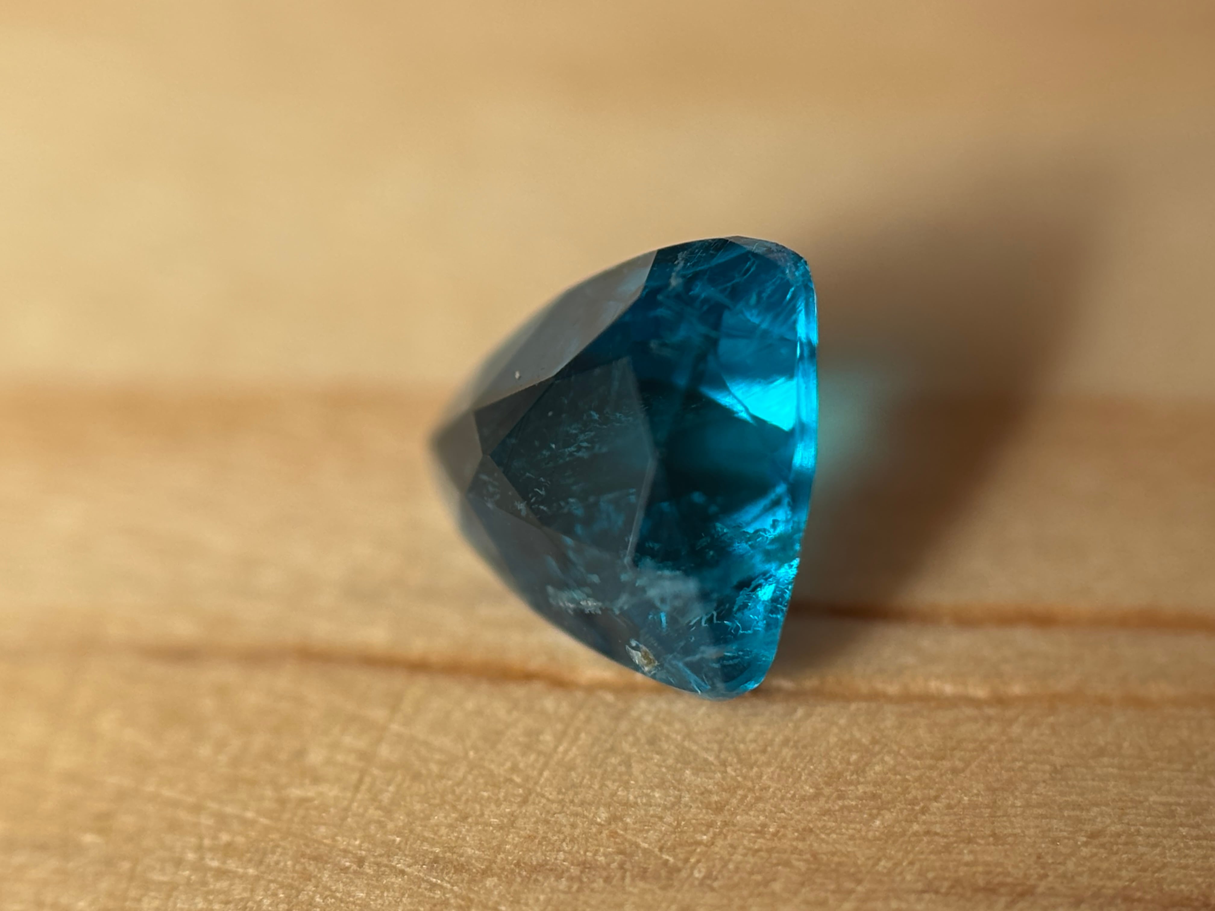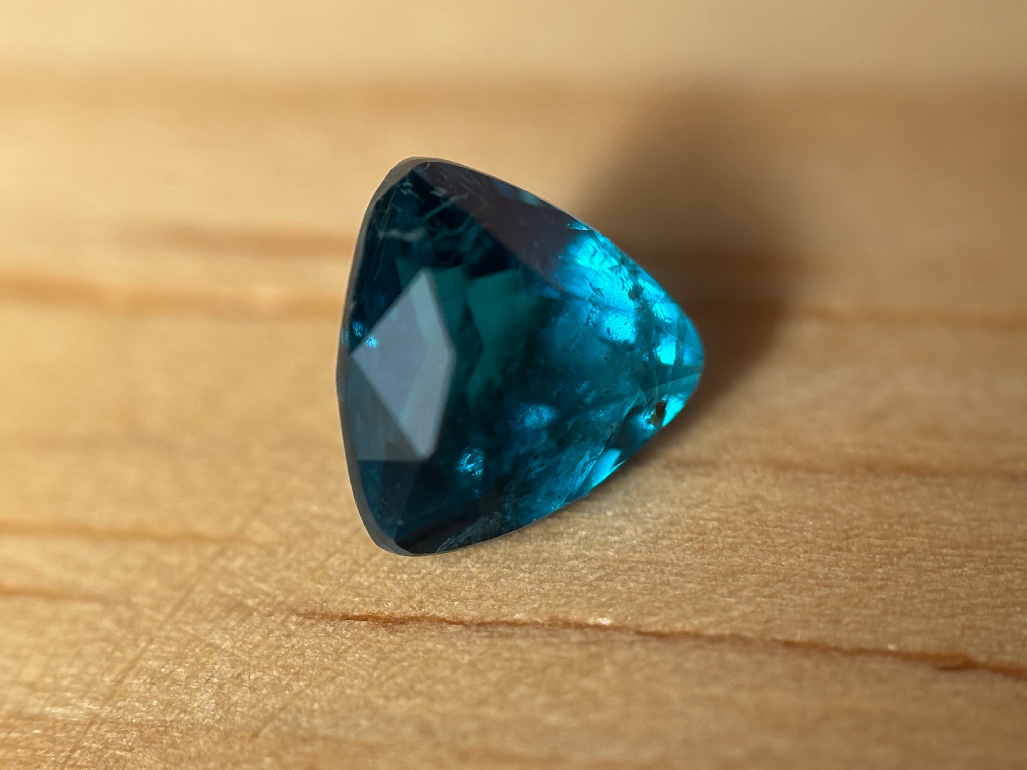 この子は色とネオン感が何よりも素敵です。とにかく濃い青緑は、オールドマインのパライバに似ています。白熱灯下で青単色へカラーシフトする様子は、他のお石よりもはっきり感じられます。実物はもう少し色濃く緑を噛んでおり、10枚目の白背景の写真が近い印象です。