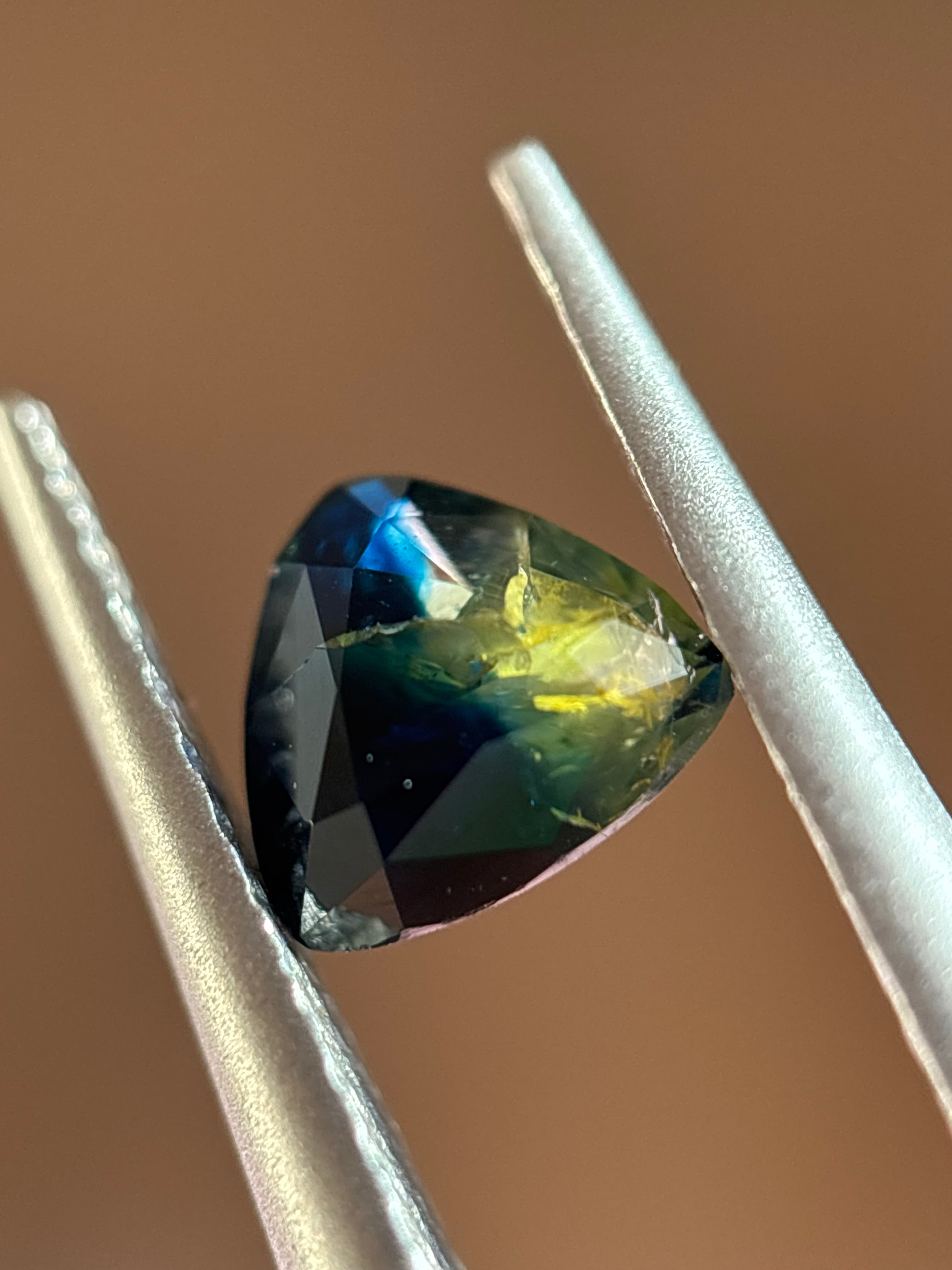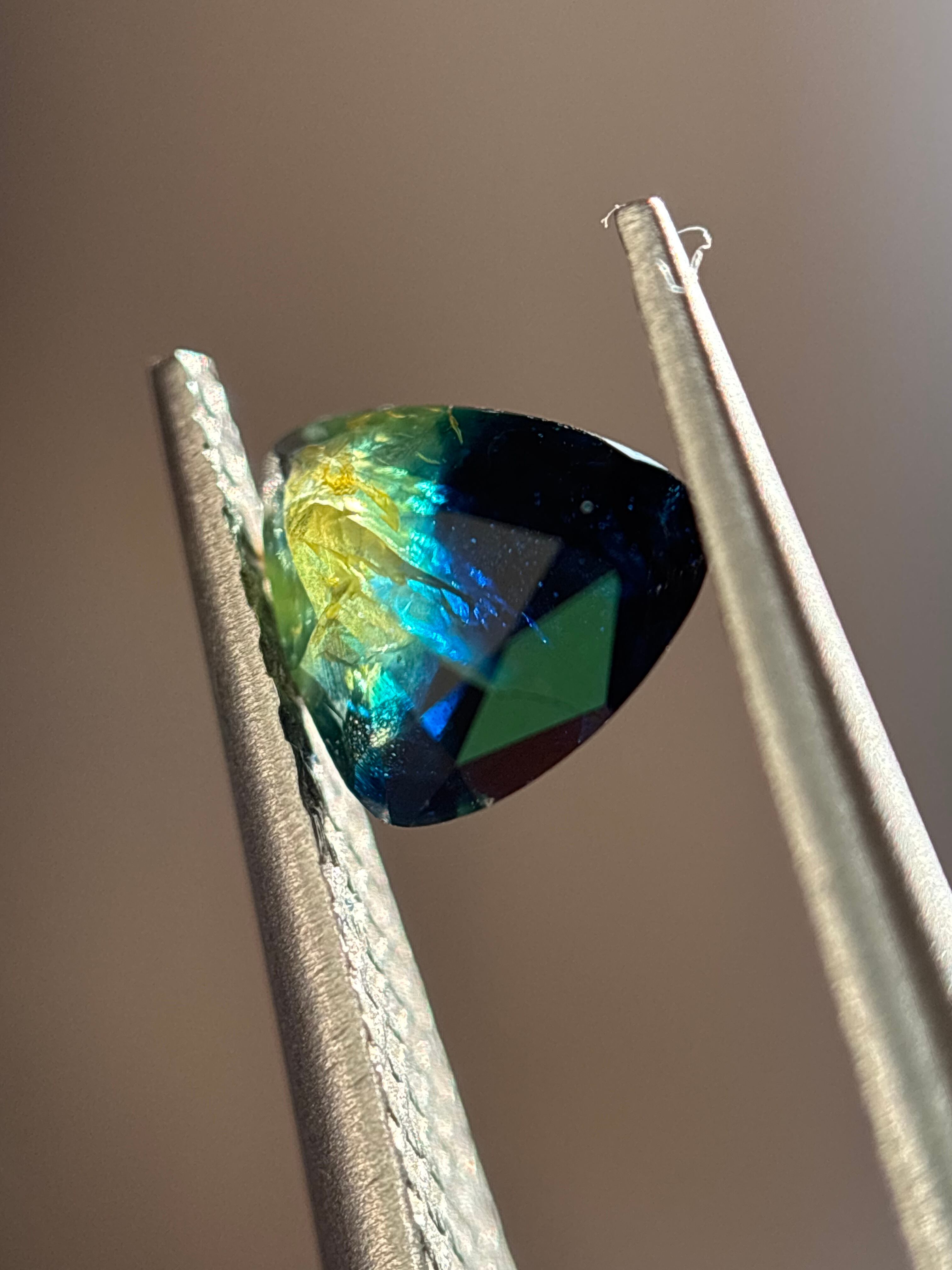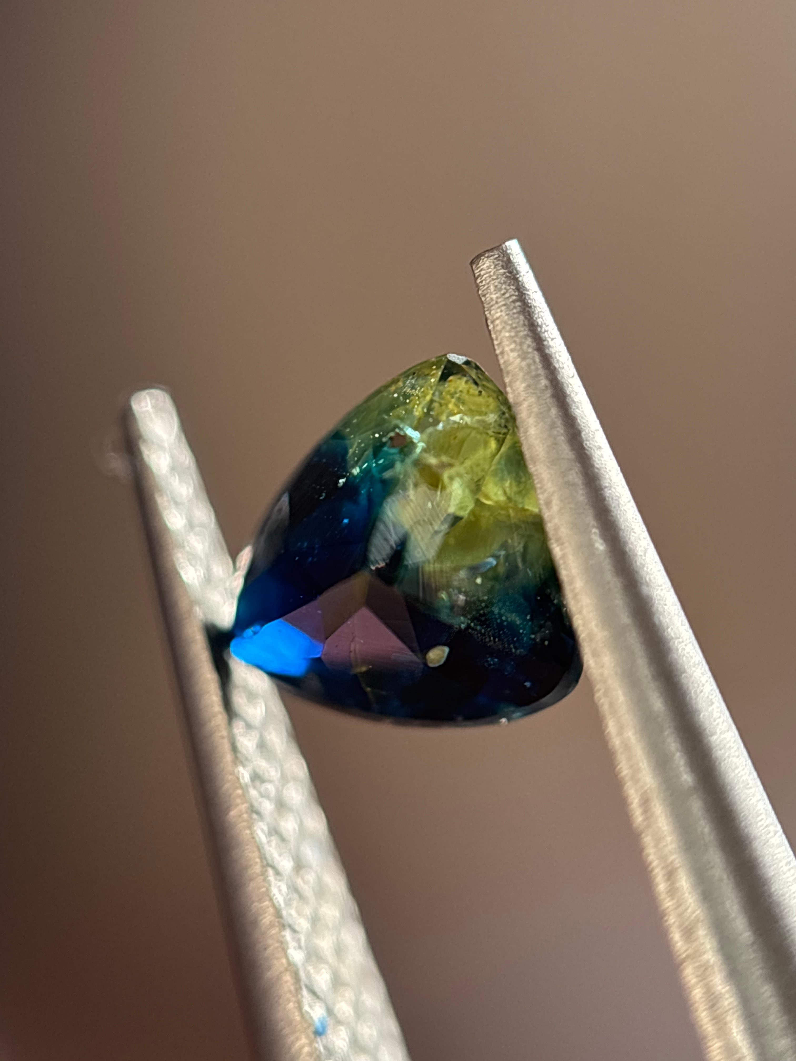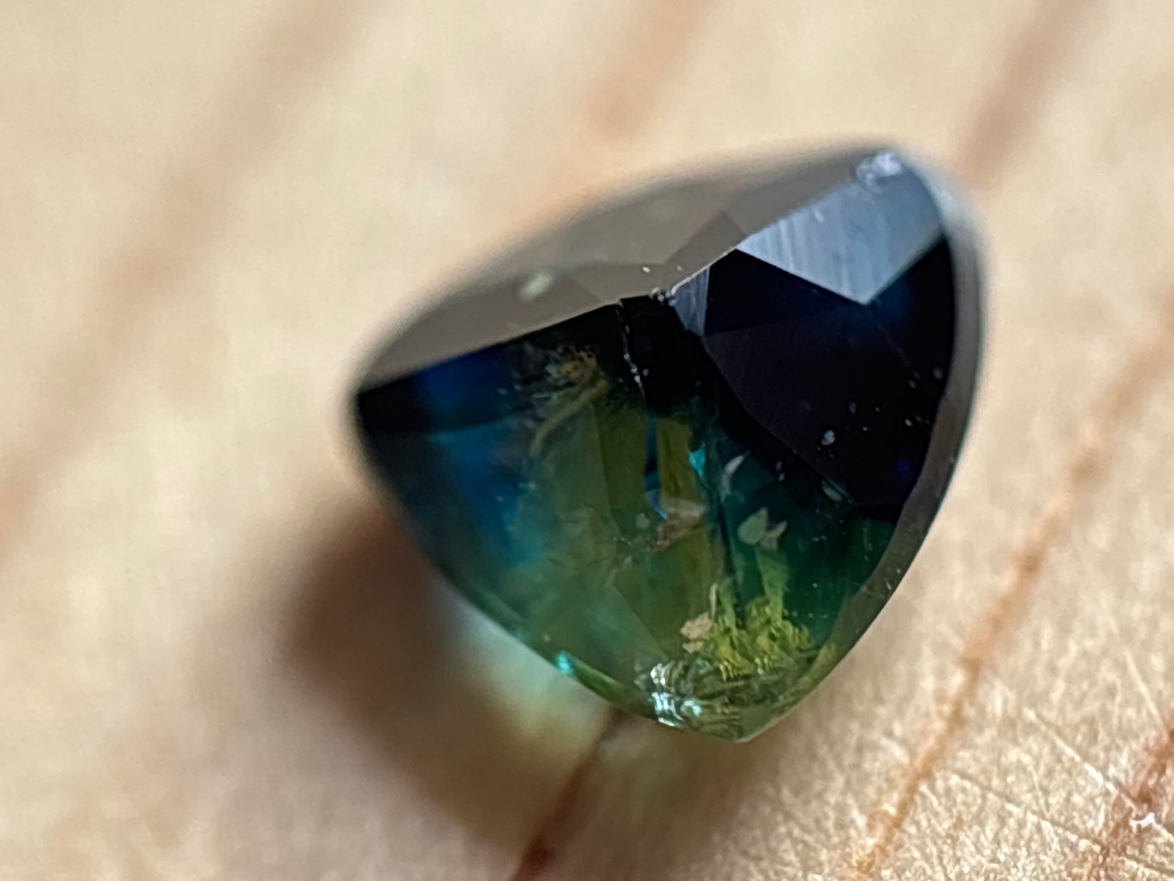 この子は、物凄くくせ強で、個性的なルースです。日光下で観察すると真価を発揮します。ベースの深い青を見せ、黄色い部分が眩く輝き、その間にはブルーグリーンの光をチカッと見せる、ポテンシャルが無限大のルースです!!
