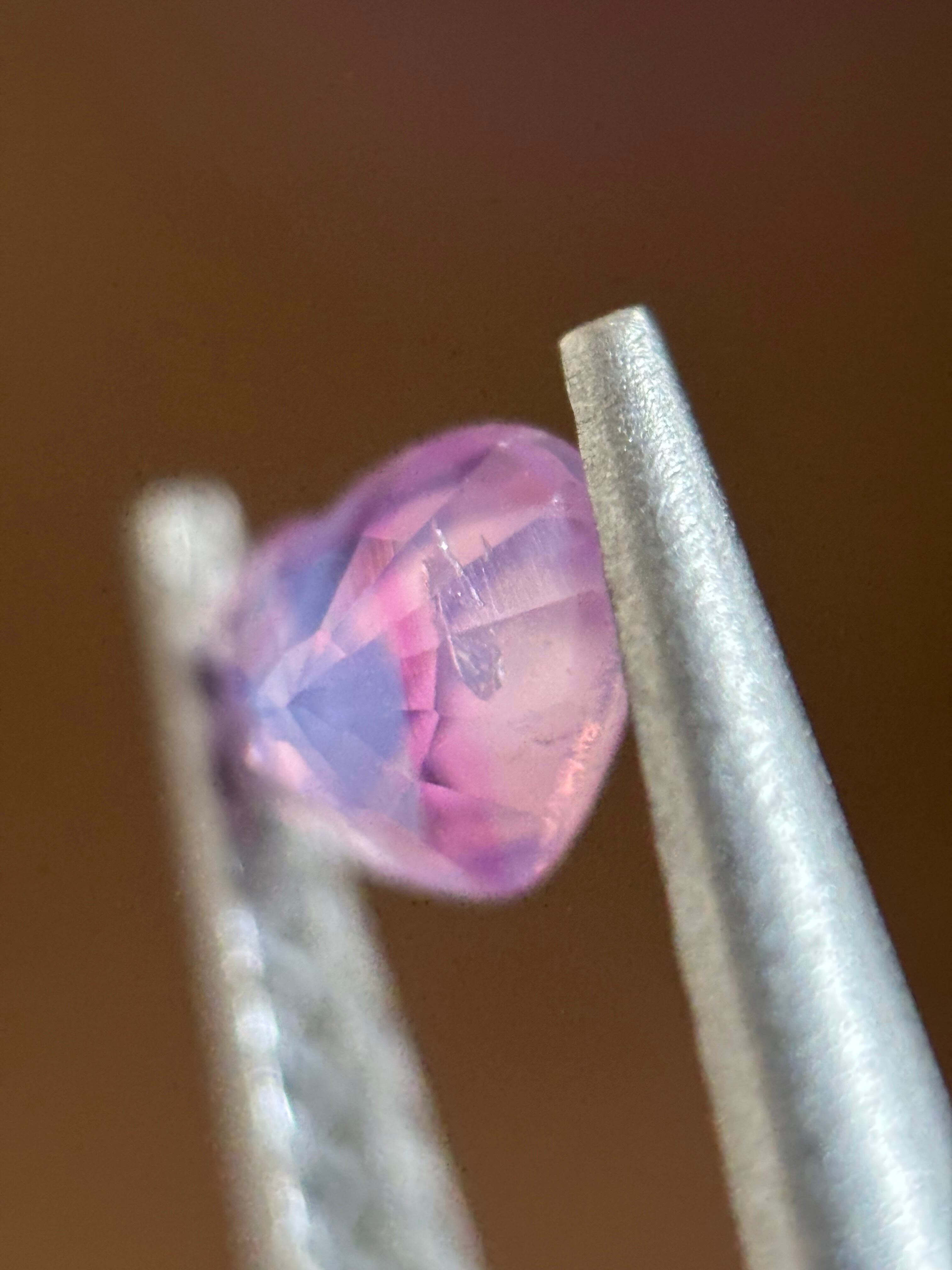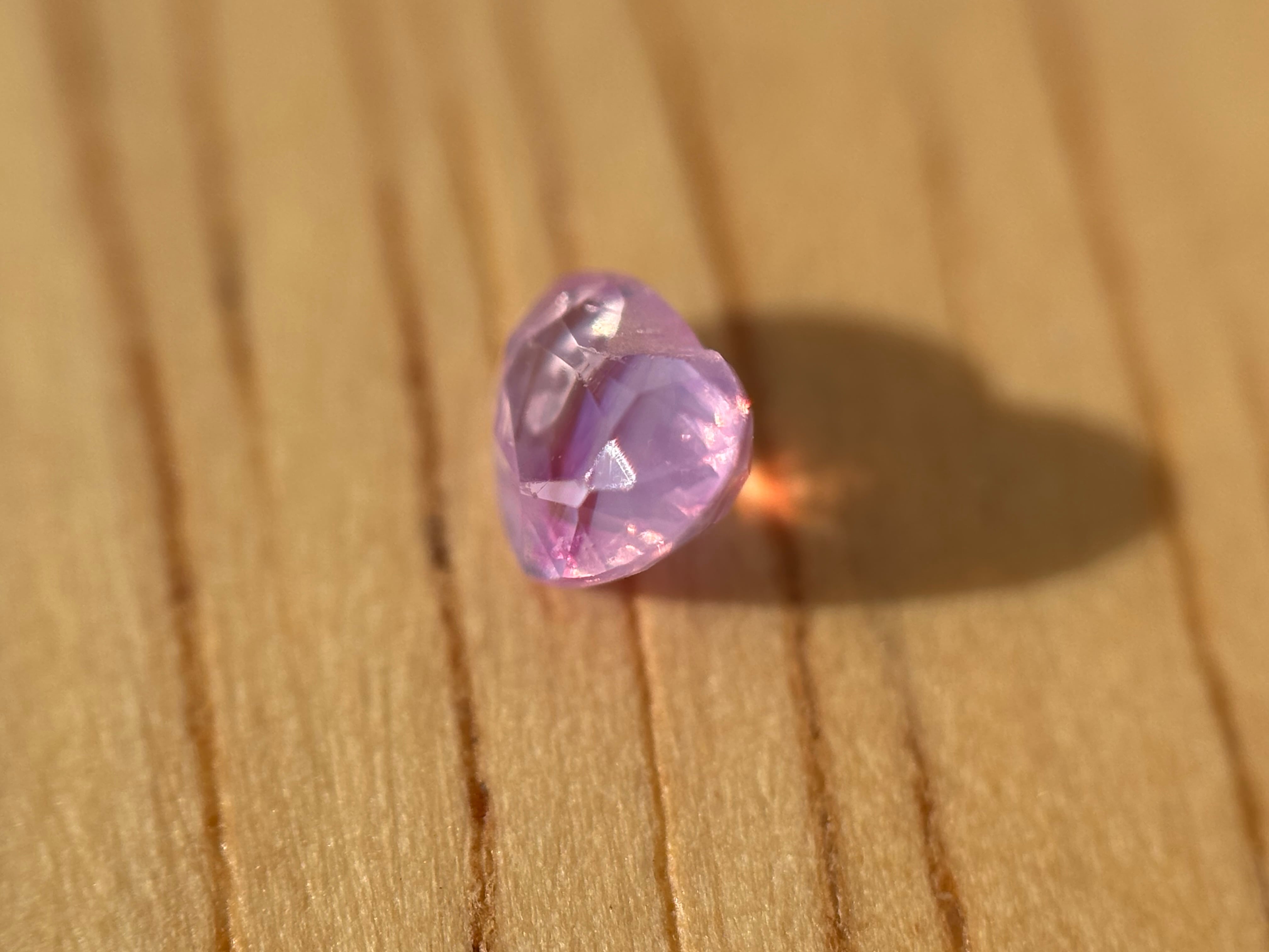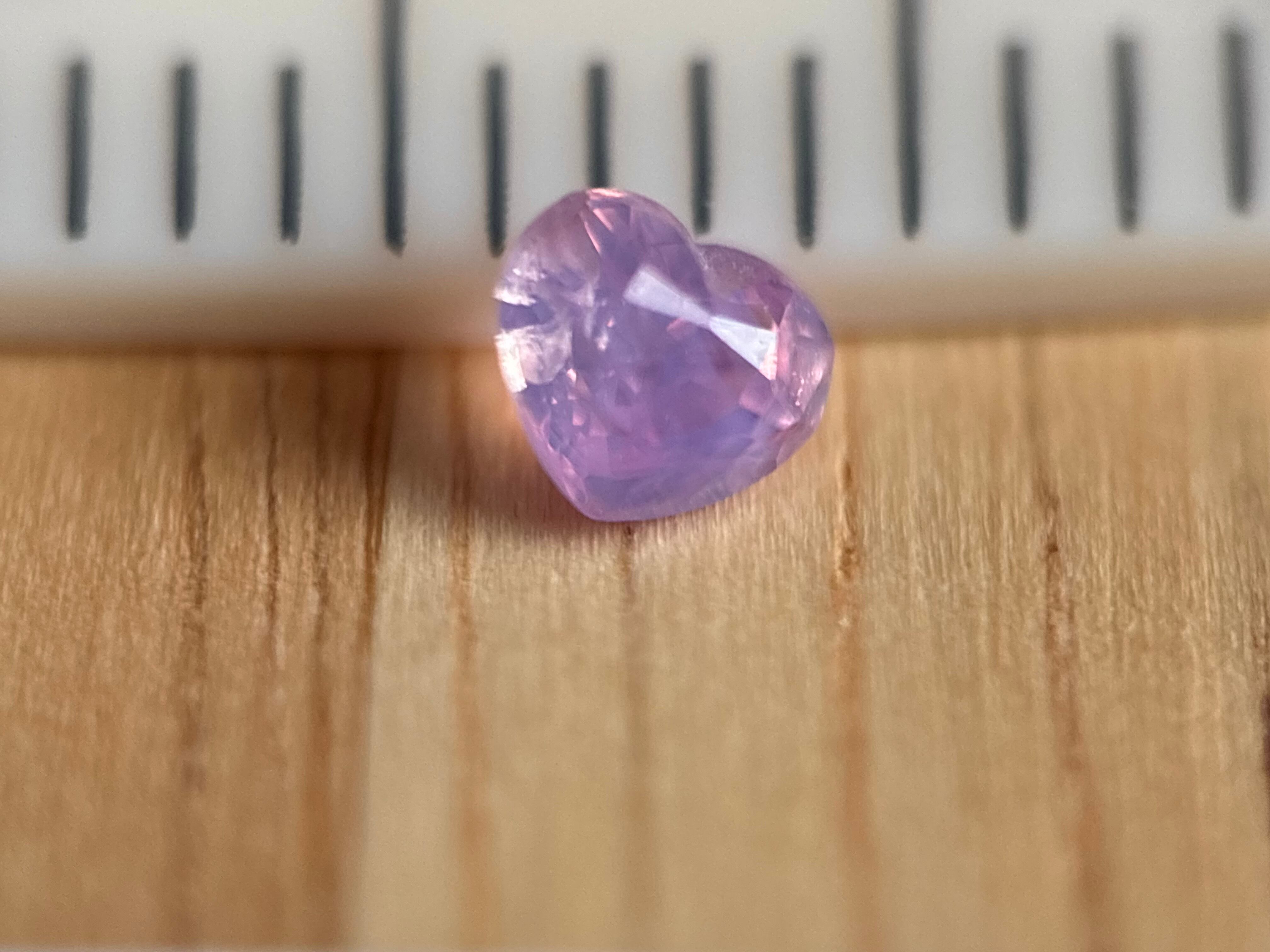 しっかりとしたオレンジ・黄色のシラーが輝く、貴重なハートのシルキーサファイアです。シルキーサファイアもだいぶ出回っては参りましたが、カットや色味、シルキー度合いは玉石混交かと思います。この子は少し小粒ですがシラーが全面とっても強く、色味も可愛いラブリーピンク、黒インクルなどに阻害されない綺麗な子です♪