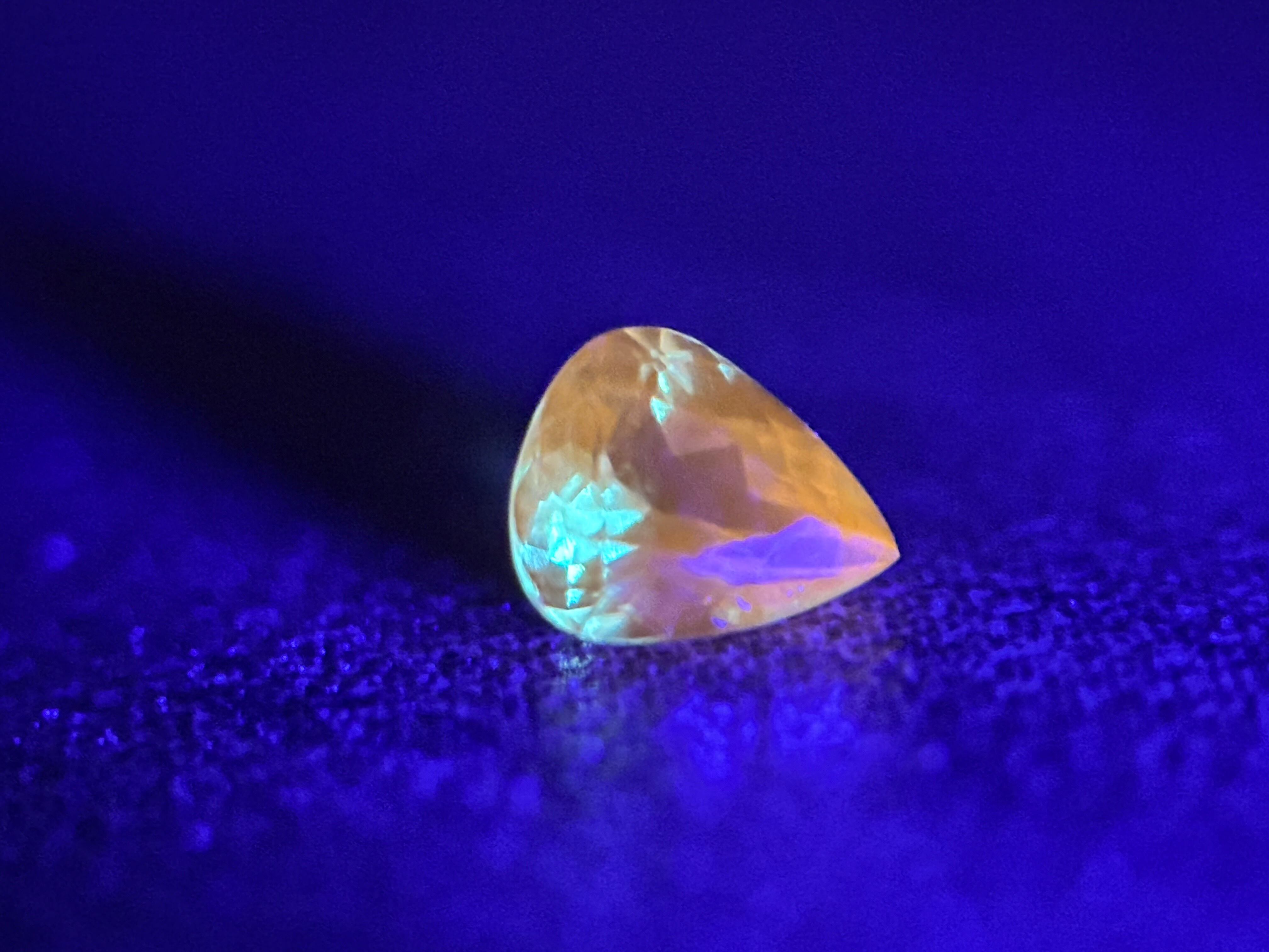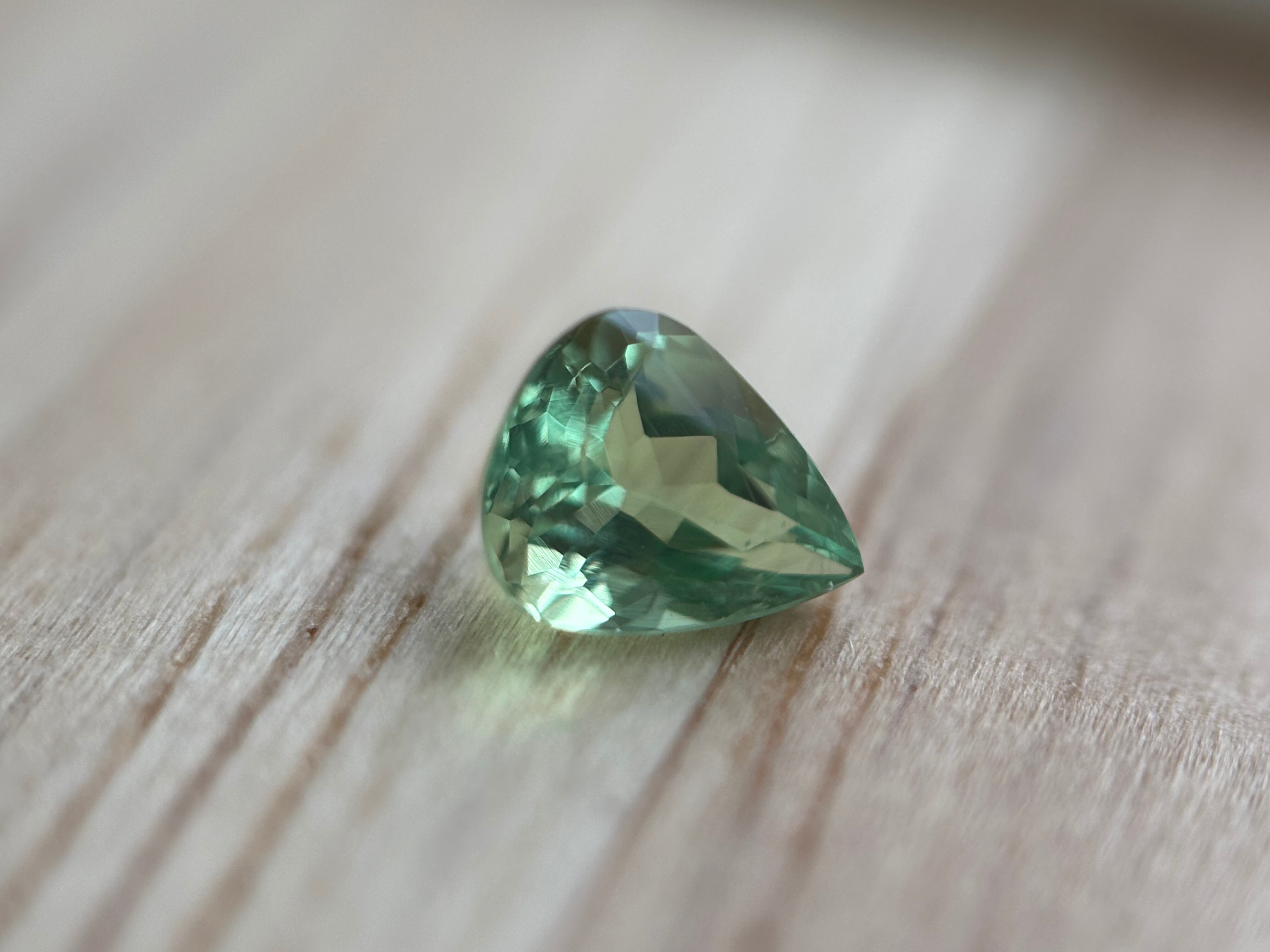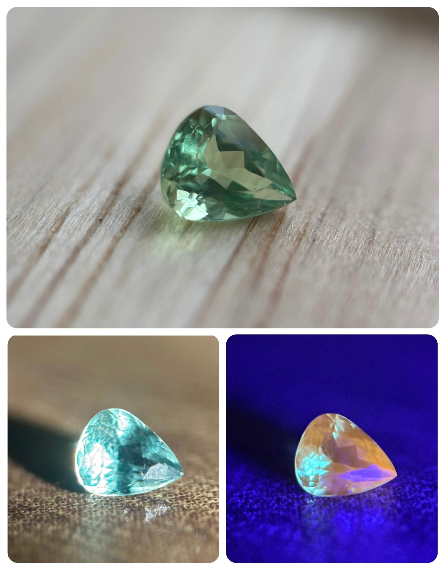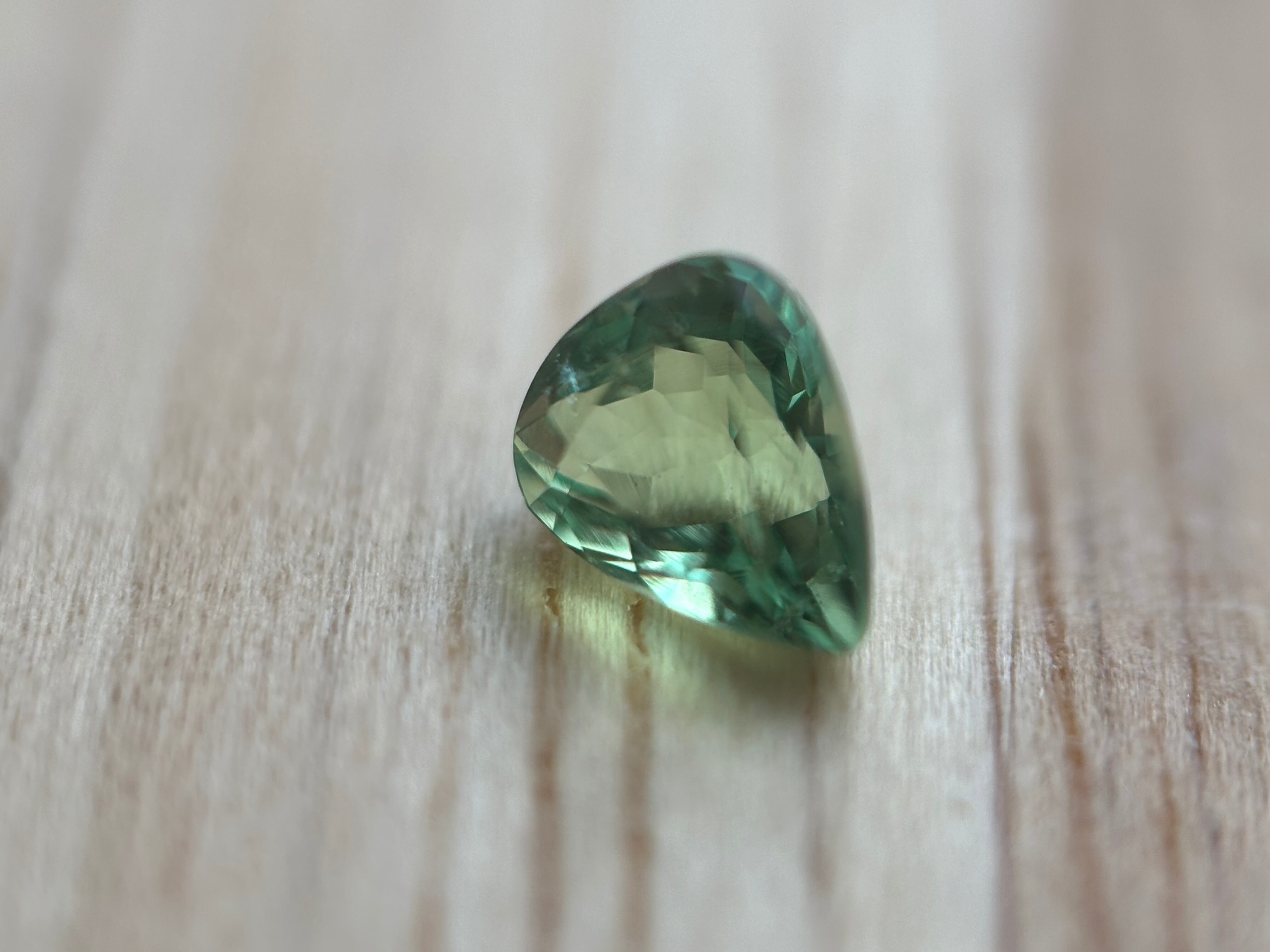 この子はグリーンアウイの中でも抜群に透明度の高い子です。恐らく今出品している子では1番透明な子かと思われます。なお、市販のペンライトの白熱灯にて、黄緑から水色へのカラーシフトが確認できます。